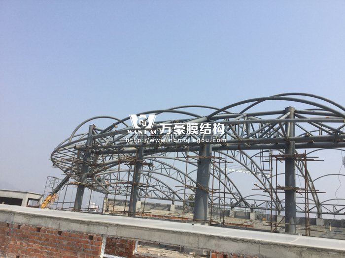 橫店夢(mèng)幻谷海豚館鋼膜結(jié)構(gòu),前兩張為鋼結(jié)構(gòu)圖片,后面的是安裝上藍(lán)色膜結(jié)構(gòu)后的圖片