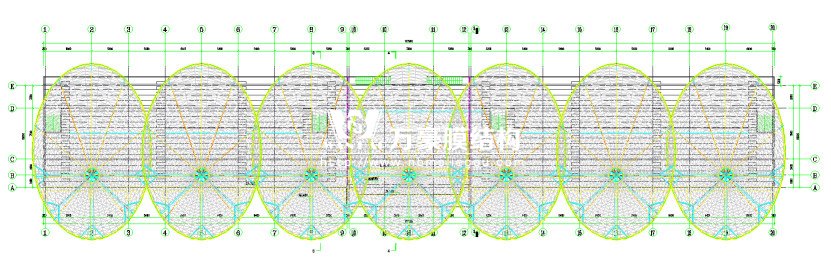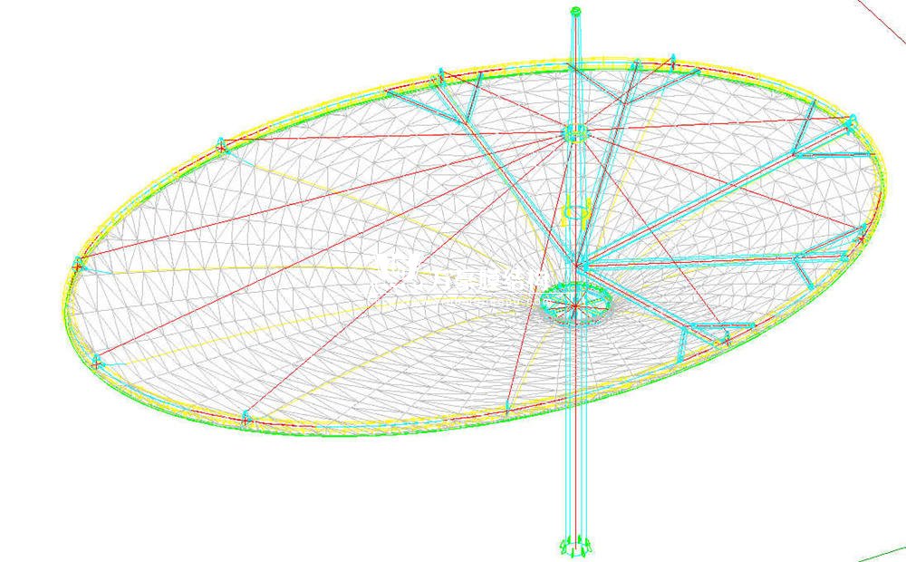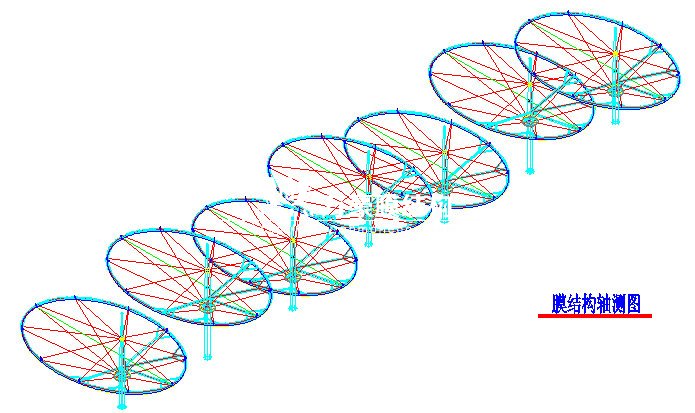 膜結(jié)構(gòu)工程簡(jiǎn)介:膜結(jié)構(gòu)雨棚位于室外看臺(tái)A-E軸/1-20軸區(qū)域。膜結(jié)構(gòu)雨棚采用張拉索膜結(jié)構(gòu),膜材采用進(jìn)口法拉利1502t2膜材,雨棚柱頂標(biāo)高32.643米,由7個(gè)長(zhǎng)30.08米,寬17.38米的倒傘形狀的單體組成。