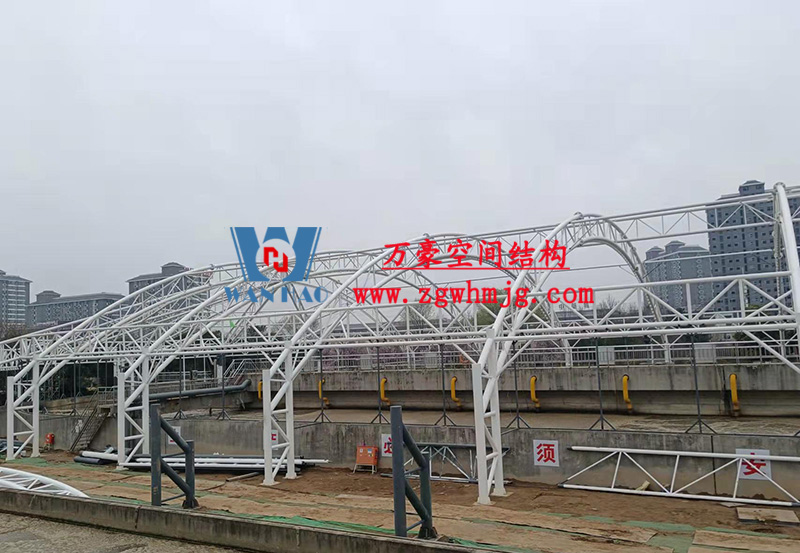 目前,進水口、粗格柵、細格柵、厭氧池兩個池子鋼結構都已完成 ,南區鋼構全部完成,膜安裝完成兩塊(兩半圓),北區鋼構西側桁架完成,開始吊裝第三四桁架 。